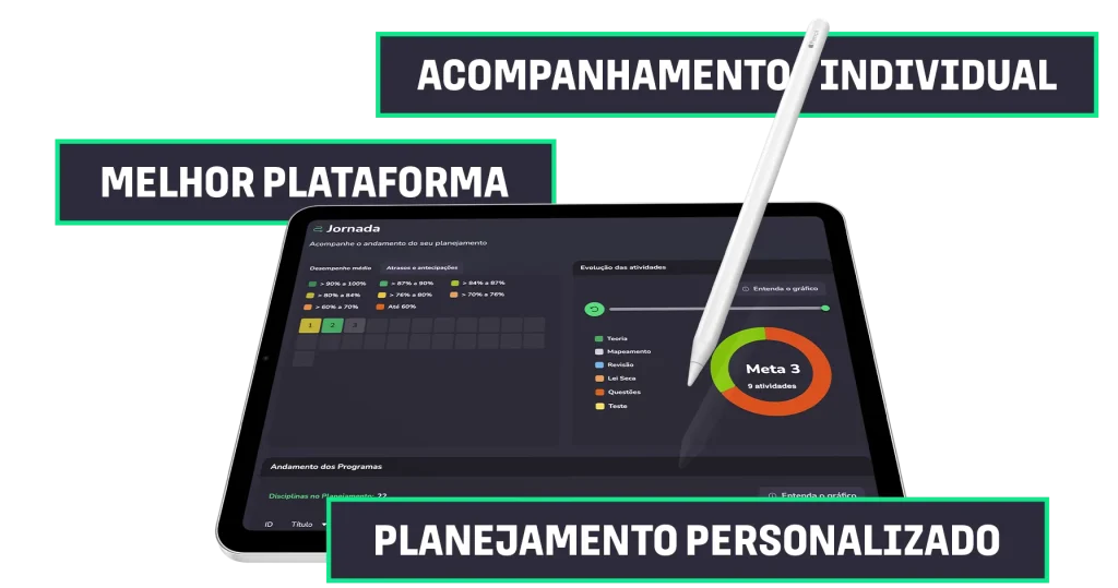 Toda semana você terá uma meta personalizada, indicando exatamente o que e quando fazer. Seu trabalho será só sentar e estudar. Chega de perder tempo com planejamento, e comece a estudar de forma eficiente hoje mesmo!