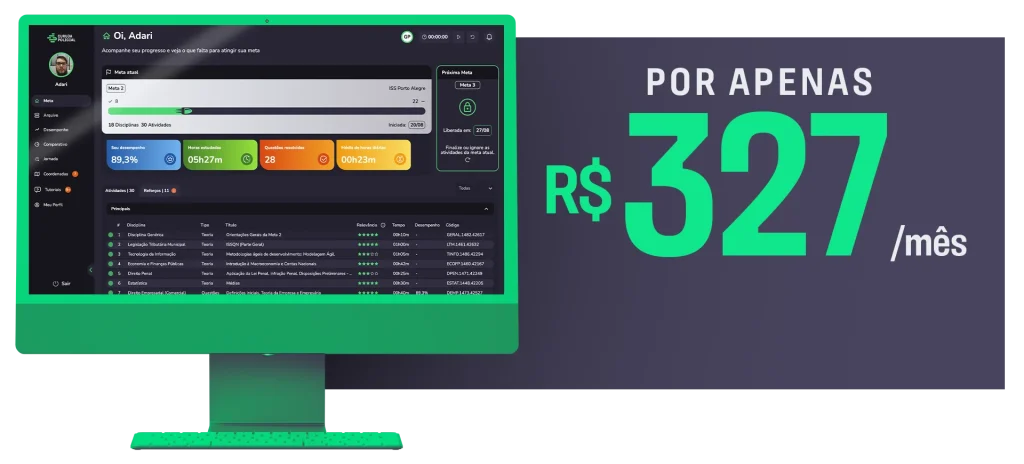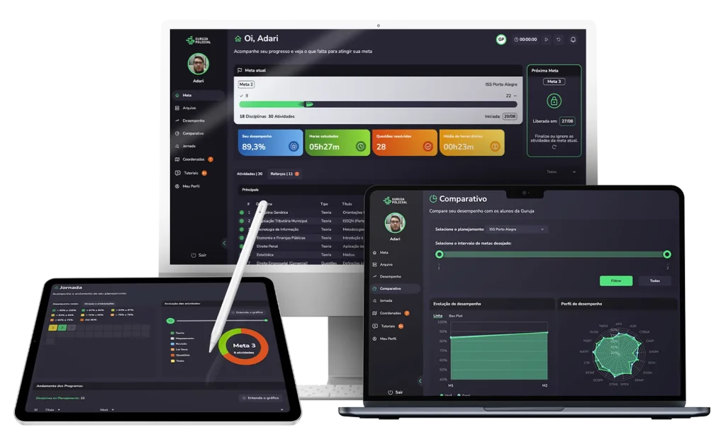 Você terá uma programação completa do seu estudo. Isso abrange a proposição de metas semanais com atividades diárias, revisões condicionais, desempenho comparativo em tempo real, gráficos de desempenho, etc.